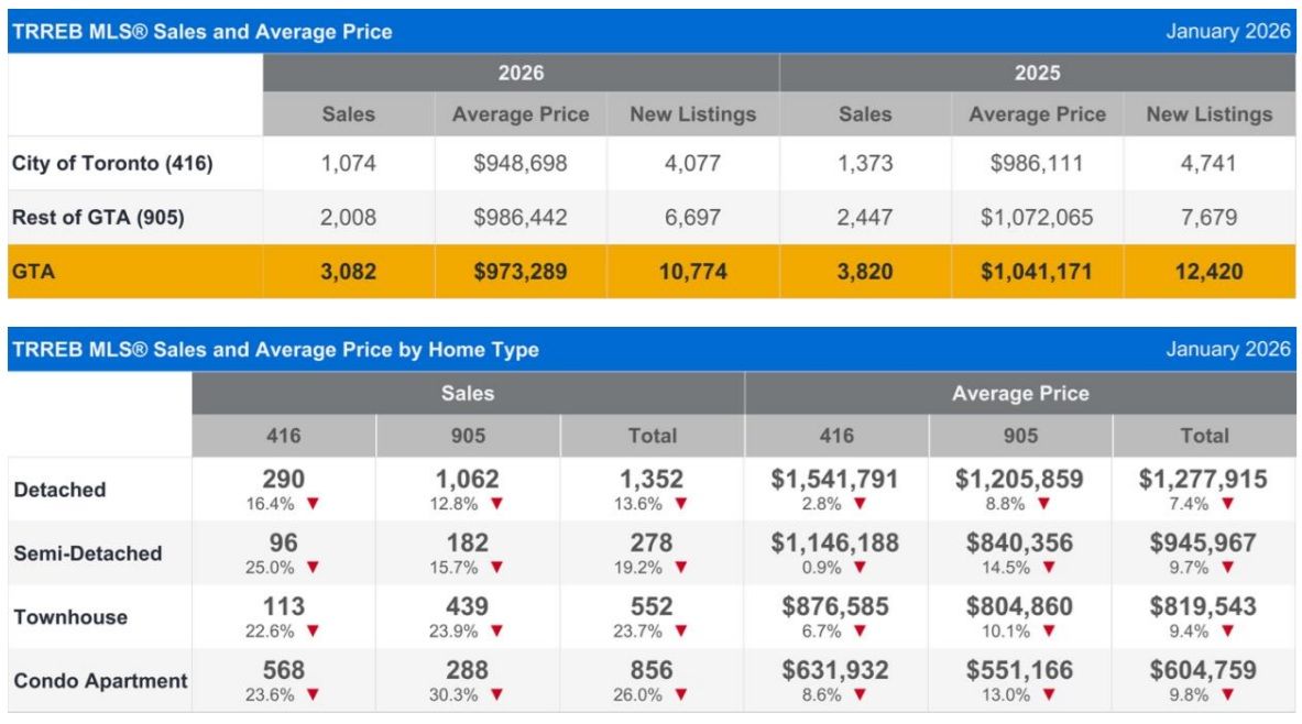 The MLS® Home Price Index (MLS® HPI) Composite benchmark was down by eight per cent year-over-year in January 2026. The average selling price, at $973,289, was down by 6.5 per cent compared to January 2025.